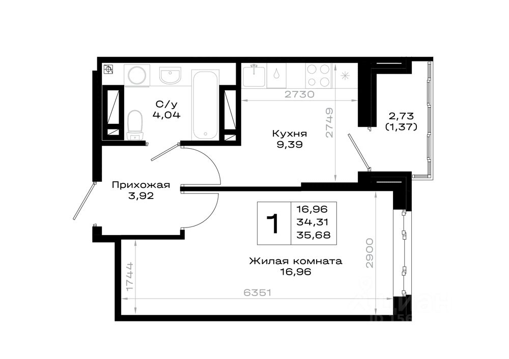 Общая площадь35,68 м2