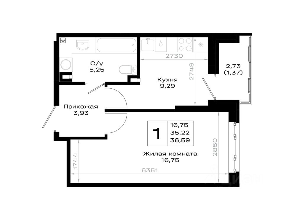 Общая площадь36,59 м2