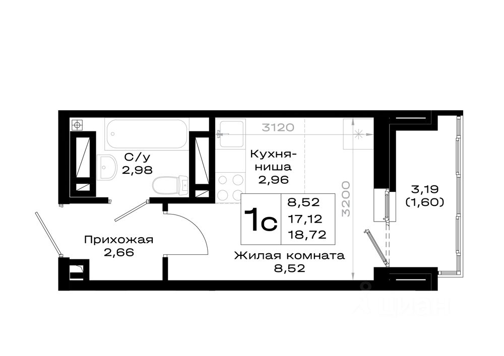 Общая площадь18,72 м2