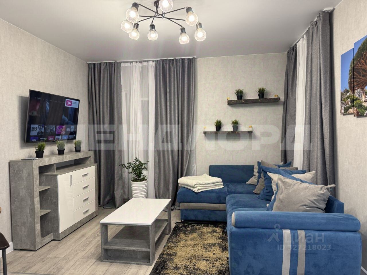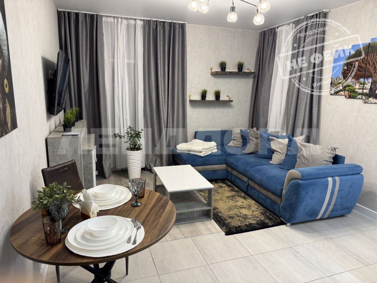 В квартире выполнен ремонт из качественных материалов. Стильный интерьер с зонированием пространства.