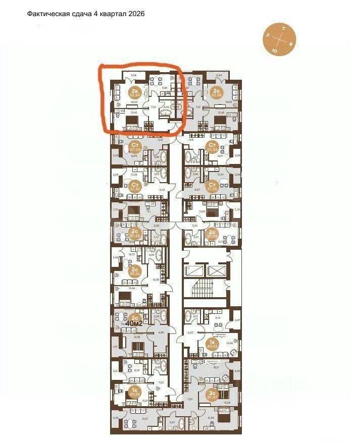 Продается просторная 2-комнатная квартира площадью 52.54 кв.м в кирпичном доме 2026 года постройки.