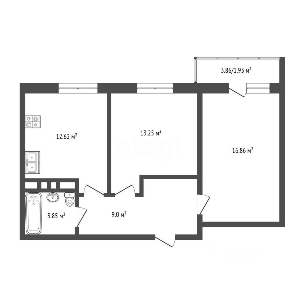 Общая площадь квартиры 57,3 кв Кухня - 12.62 кв Лоджия - 3.86 кв Санузел - 3.85 кв