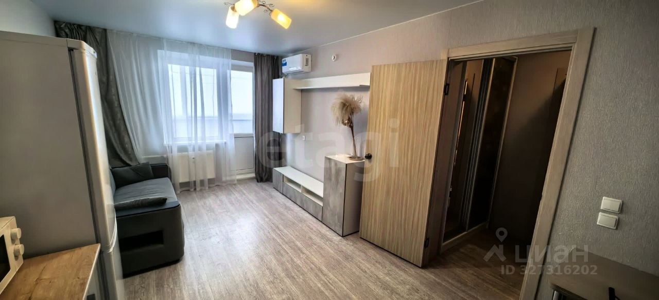 В студии остается мебель и техника: диван, шкаф-купе, тумба, вешалка, стол, стулья, кухонный гарнитур, два открытых стеллажа, стенка, пенал в ванной, зеркало, стиральная машина, холодильник, микроволновая печь, чайник, кондиционер, роутер.