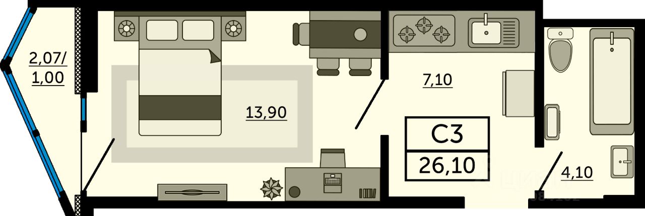 В продаже квартира-студия в новостройке. Лучшее решение для молодой семьи, под сдачу или для инвестиций. Это современный вариант просторной студии с полноценной прихожей. Благодаря продуманному зонированию при входе достаточно места для кухонной зоны или для хранения вещей. Успейте забронировать квартиру мечты напрямую от застройщика.