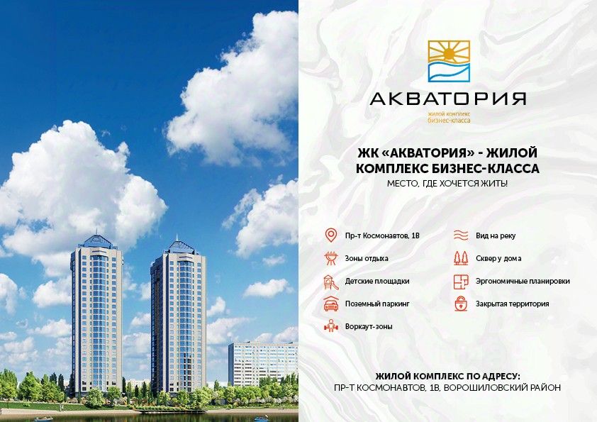 ЖК ''Акватория'' - жилой комплекс бизнес-класса по адресу пр-кт. Космонавтов, 1В. Это современные благоустроенные дома вблизи водоёма со множеством преимуществ: - Монолитно-каркасная технология строительства. - Облицовка кирпич в соответствии с ГОСТом - Срок ввода в эксплуатацию II квартал 2024 года. - 2 литера по 26 этажей. - 10 минут до центра города. - Подземный паркинг. - Продуманные зоны отдыха. - Уютные и безопасные детские площадки. - Зоны для воркаута на свежем воздухе. - Уникальные виды на реку Темерник и парк Дружбы.