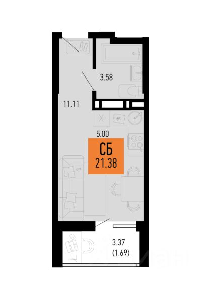 Общая площадь21,38 м2